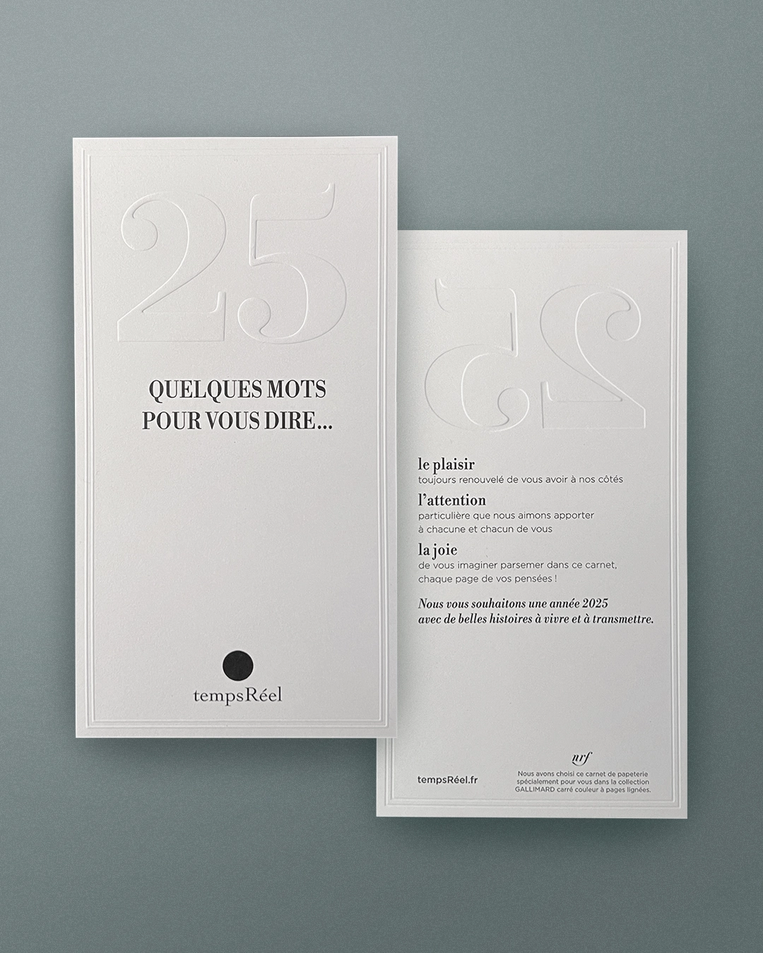 Nous avons accompagné notre carte de vœux 2025 d’un carnet à pages lignées de la collection GALLIMARD.