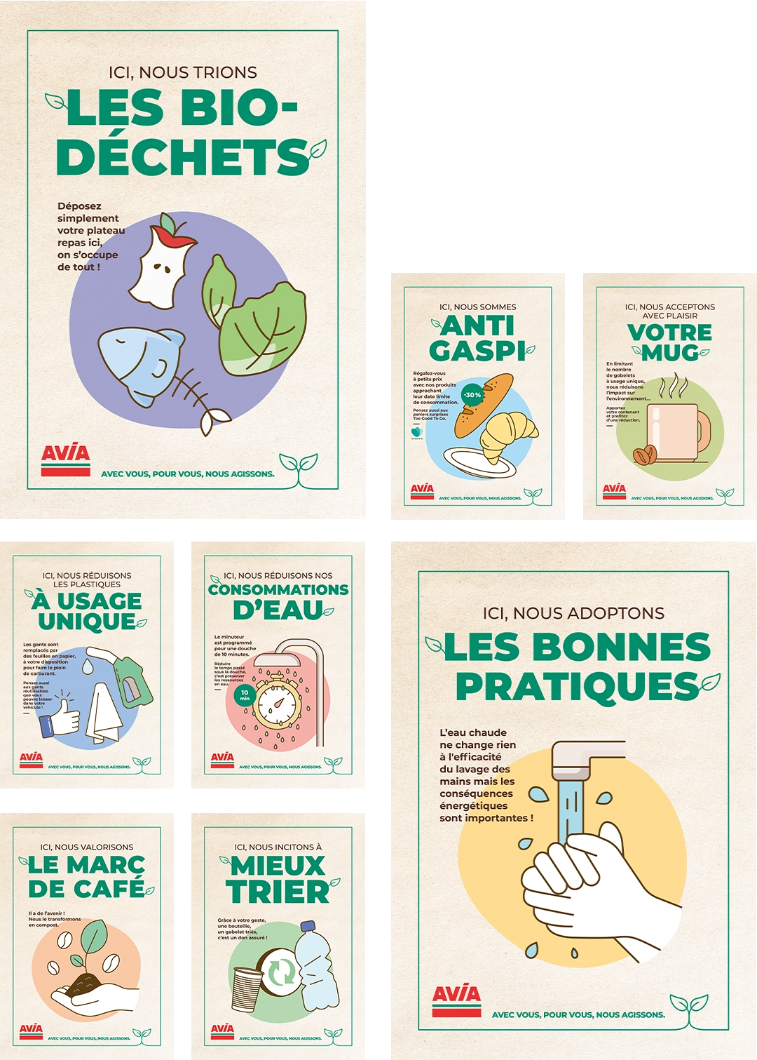 Sur la base de 8 thématiques essentielles, comme la réduction des consommations énergétiques, la lutte contre le gaspillage alimentaire ou encore le tri des biodéchets, nous avons mis au point un concept créatif faisant le lien entre le geste de l’usager et le bénéfice pour l’environnement, avec des messages simples et des illustrations claires.