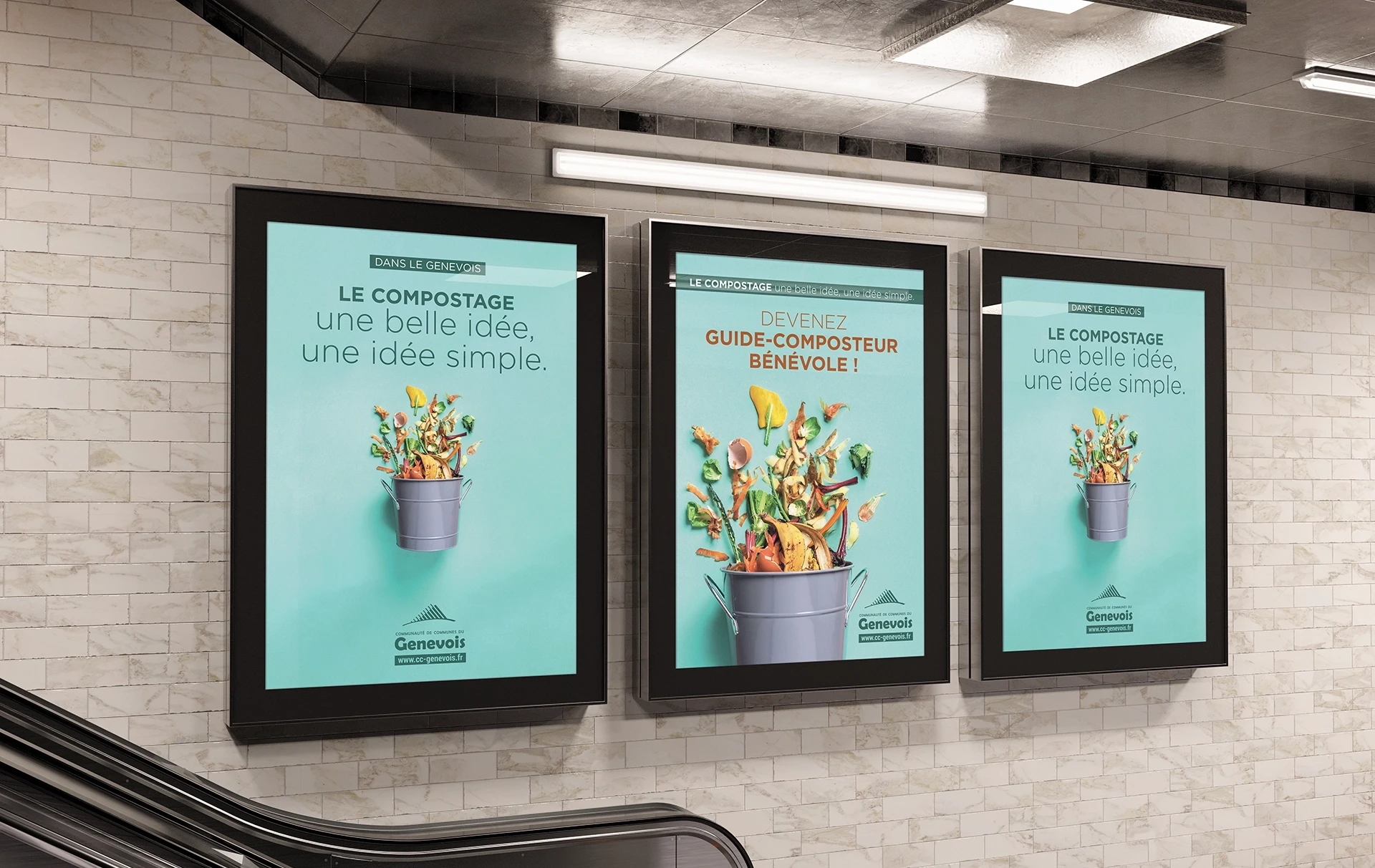 La campagne « Le compostage, une belle idée, une idée simple » a fait l’objet d’un déploiement important sur le territoire du Genevois avec une déclinaison sur une grande variété de supports : guide du compostage, kakémonos, flyer compostage individuel, flyer compostage collectif, flyer guide-composteur, affiche réunion d’information, panneaux pour sites de compostage et déchetterie, covering véhicules, barnum, newsletter et social media.